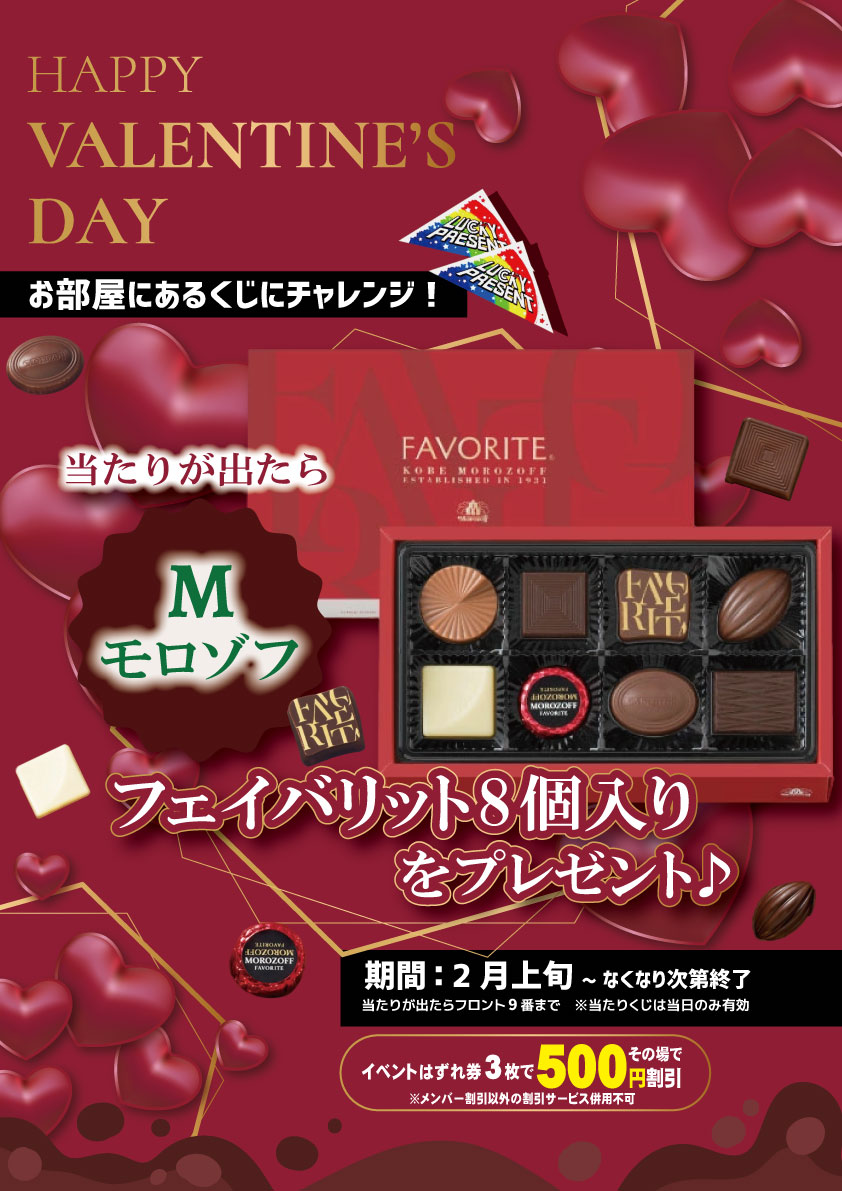 2026年2月バレンタインイベント♪ HOME ニュース 2026年2月バレンタインイベント♪ 2026年2月バレンタインイベント♪ 2月はバレンタインイベント♪ 当たりが出たら「モロゾフ」のチョコレートをプレゼント♪ お部屋にあるくじ引きにチャレンジしよう! 新着情報&お知らせ お知らせ一覧 2026年2月バレンタインイベント♪ 2026年1月ほっと快眠キャンペーン♪※このイベントは終了しました 2025年12月年末年始イベント♪※このイベントは終了しました 2025年11月さつまいもふぇあ♪※このイベントは終了しました 2025年10月ハッピーハロウィン♪※このイベントは終了しました 2025年9月フェイスパック抽選会♪※このイベントは終了しました 2025年8月スイカフェア♪※このイベントは終了しました 2025年7月ひんやりフェア♪※このイベントは終了しました 2025年6月ポップコーンフェア♪※このイベントは終了しました 【平日宿泊限定】無料サービス